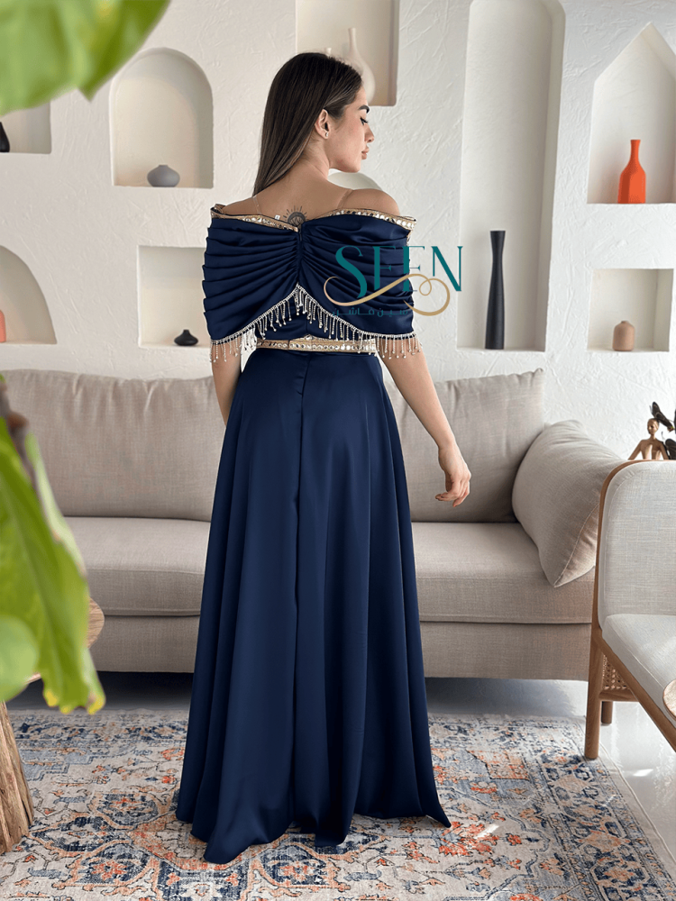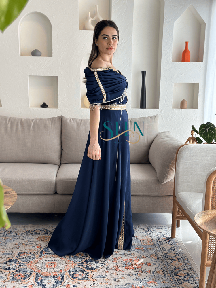 استمتعي بإطلالة خليجية أنيقة مع جلابية خليجية ناعمة مطرزة من سين فاشن. تأتي الجلابية باللون الكحلي الراقي مع تطريزات ذهبية فاخرة على التصميم، مما يضفي لمسة من الفخامة. تصميمها مكشوف الأكتاف يضفي عليها لمسة عصرية وجذابة، لتكوني متألقة في كل مناسبة خاصة.