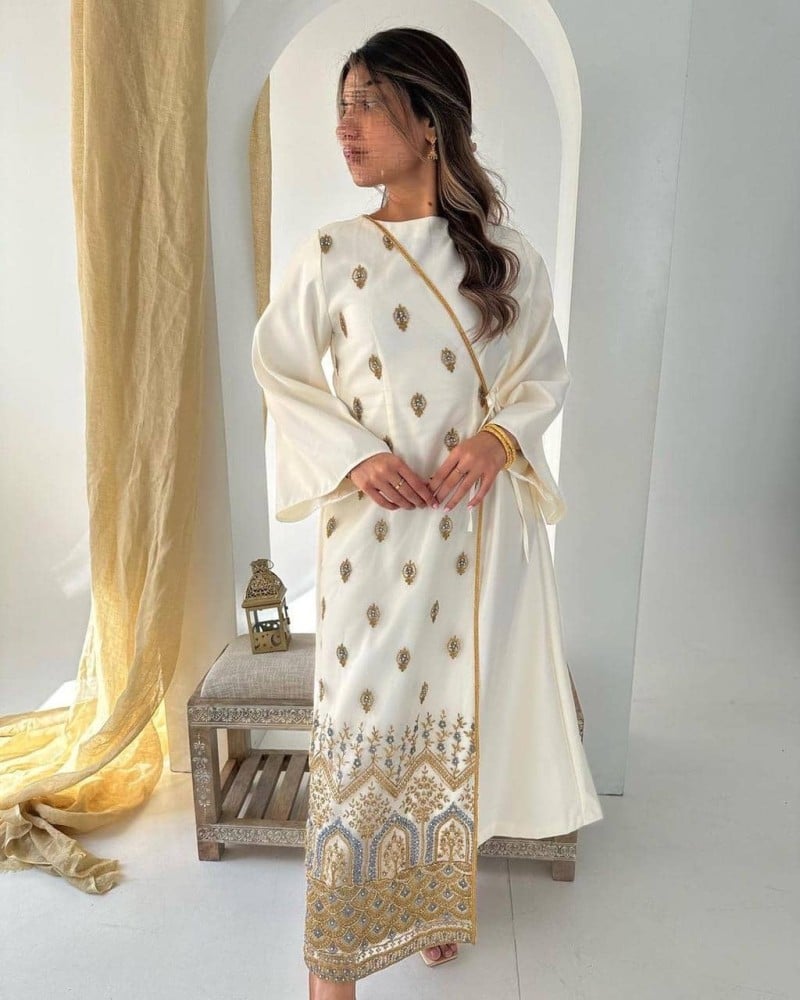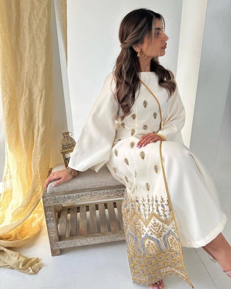 جلابية مطرزة لفة باللون الأبيض بتطريز راقي وبتفاصيل انيقة يعزز التطريز جمالية التصميم و يضفي لمسة من الجمالية على الجلابية تصميم حديث من براند سين فاشن تتناسب الجلابية جميع المناسبات الخاصة التي ترغبين في أن تبرزي فيها أناقتك و انوثتك.