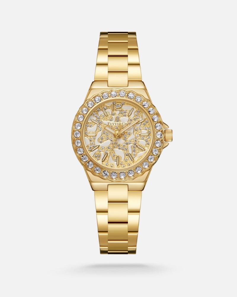 - ساعة نسائية بسير من الستيل باللون الذهبي يتزين بفصوص الزركون