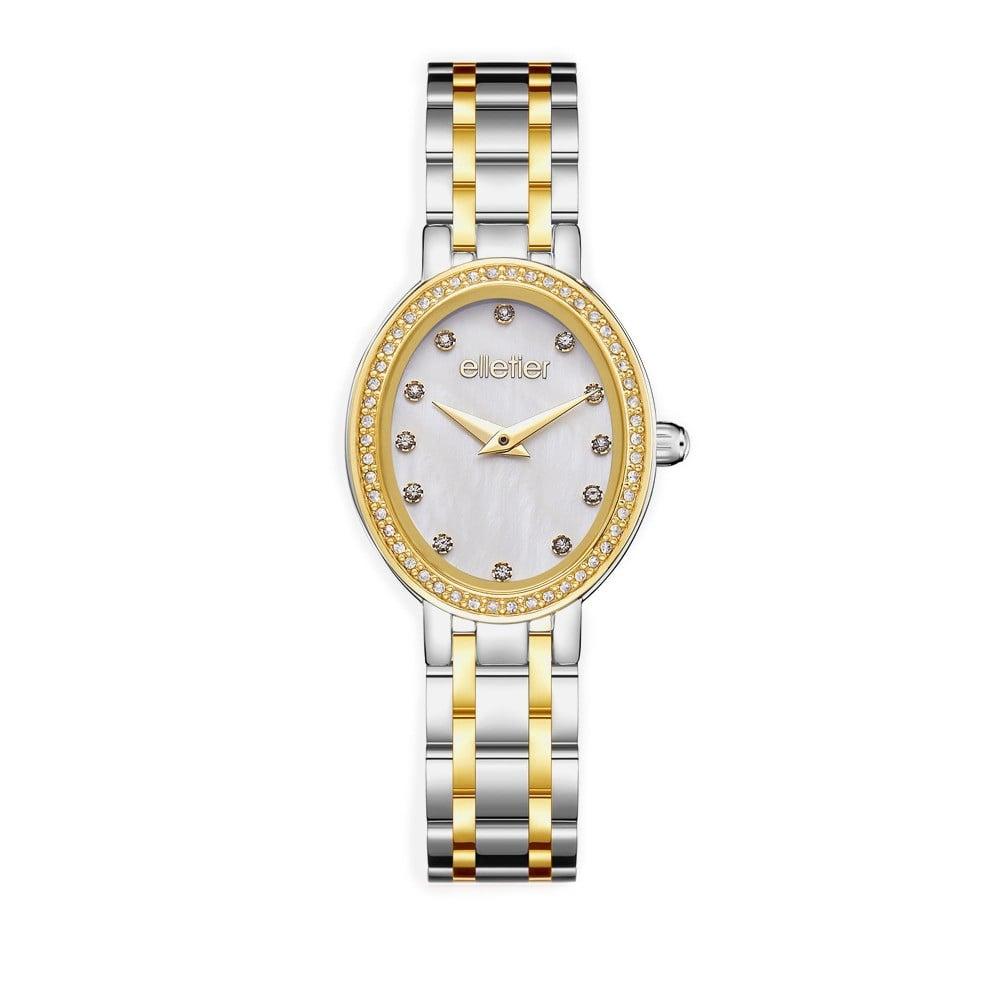 ساعه نسائيه من ماركه اليتير . ساعة بسوار من الستانلسستيل باللون الذهبي والفضي ، الساعه بميناء بيضاوي ملفتمرصع بإطار لامع بفصوص زركون اللامعه ، تتميز الساعةبتصميمها الكلاسيكي والراقية ساعه يومية بتصميم مميز ومتفرد.