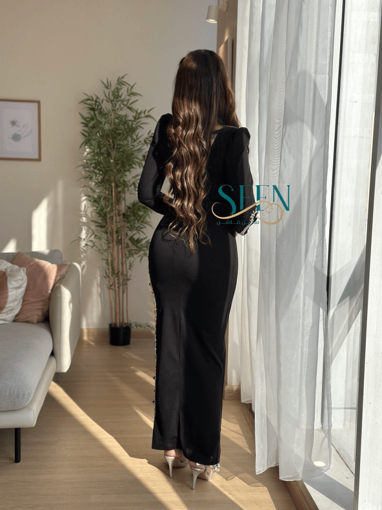 فستان نسائي ناعم باللون الأسود بأكمام طويلة مزين بخطوط الكريستال الرائعة ويتميز الفستان بتصميم انيق وجميل يبدو أكثر اثارة و فخامة سيكون اختيارا مثاليا لتتألقي وتلفتي الأنظار بأناقتك ورقيك .