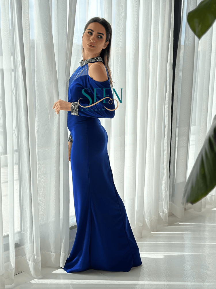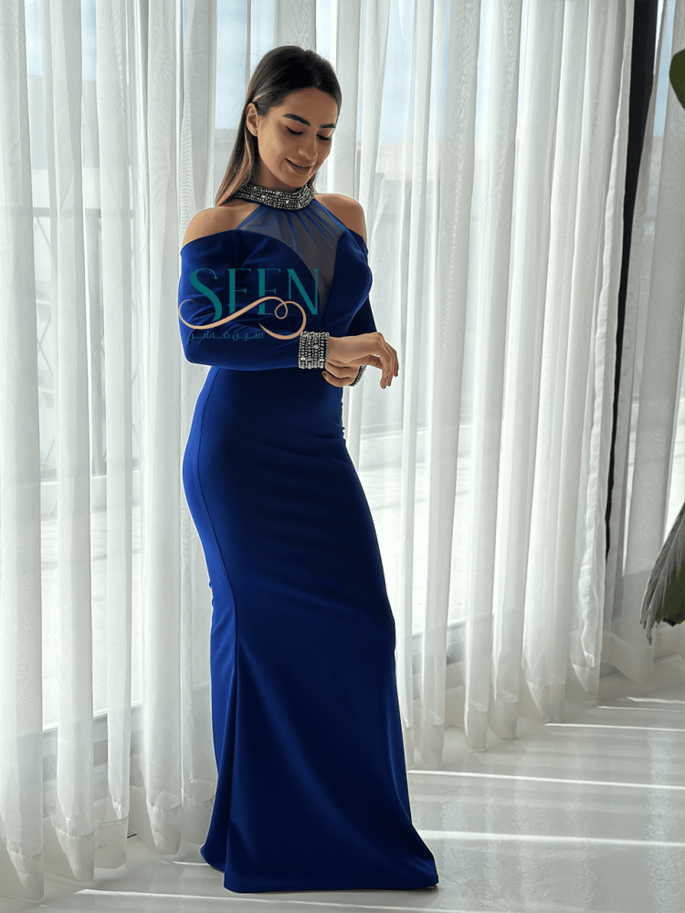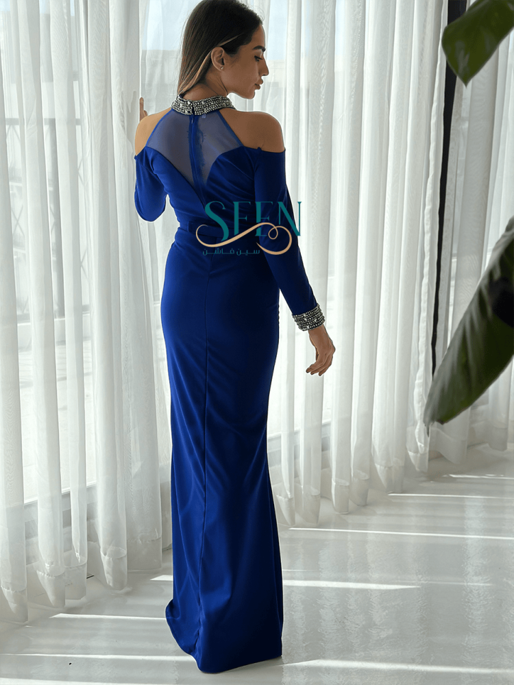 فستان أزرق طويل ناعم بأكمام طويلة مزين بالكريستال الرائعة ويتميز الفستان بتصميم انيق وجميل يبدو أكثر اثارة وفخامة سيكون اختيارا مثاليا لتتألقي وتلفتي الأنظار بأناقتك ورقيك.