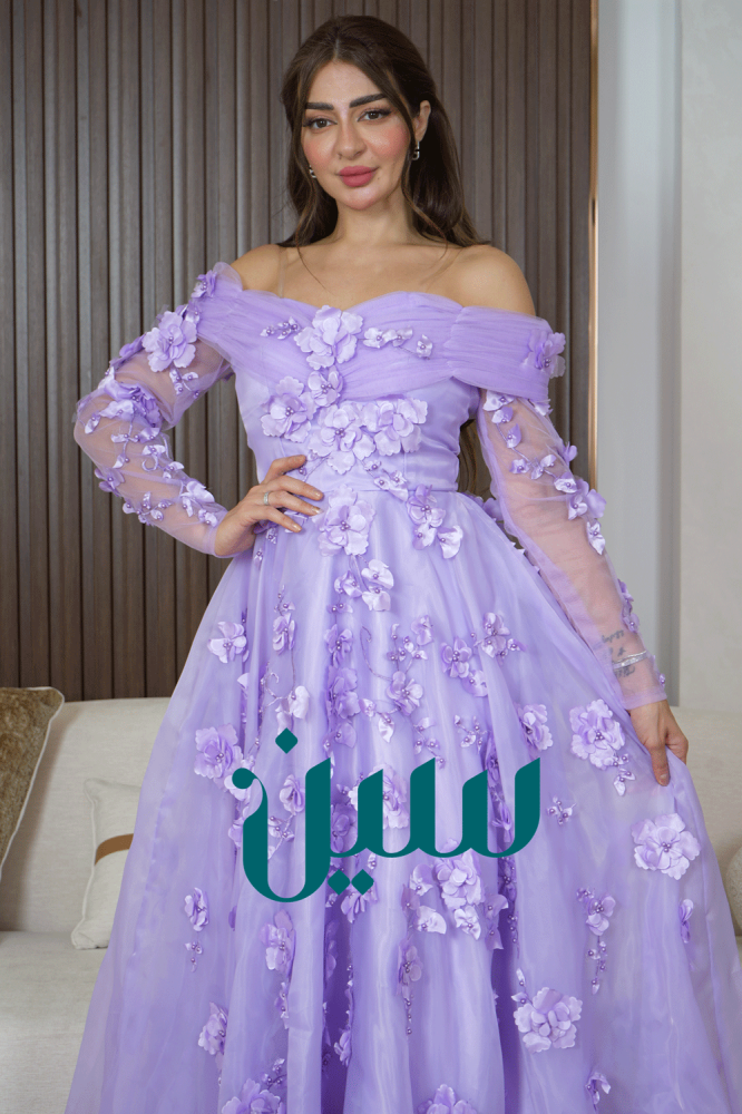 فستان نسائي سهرة راقي باللون الموف بتطريز جذاب على كافة الفستان يتميز الفستان بتصميم عصري متميز