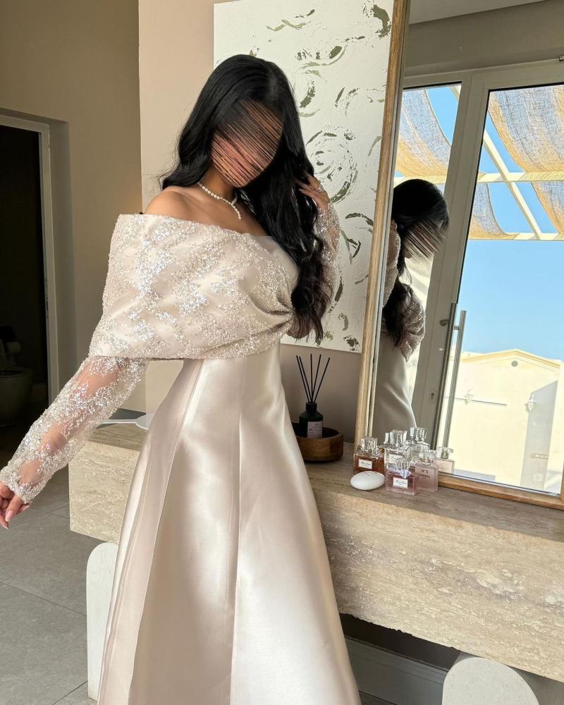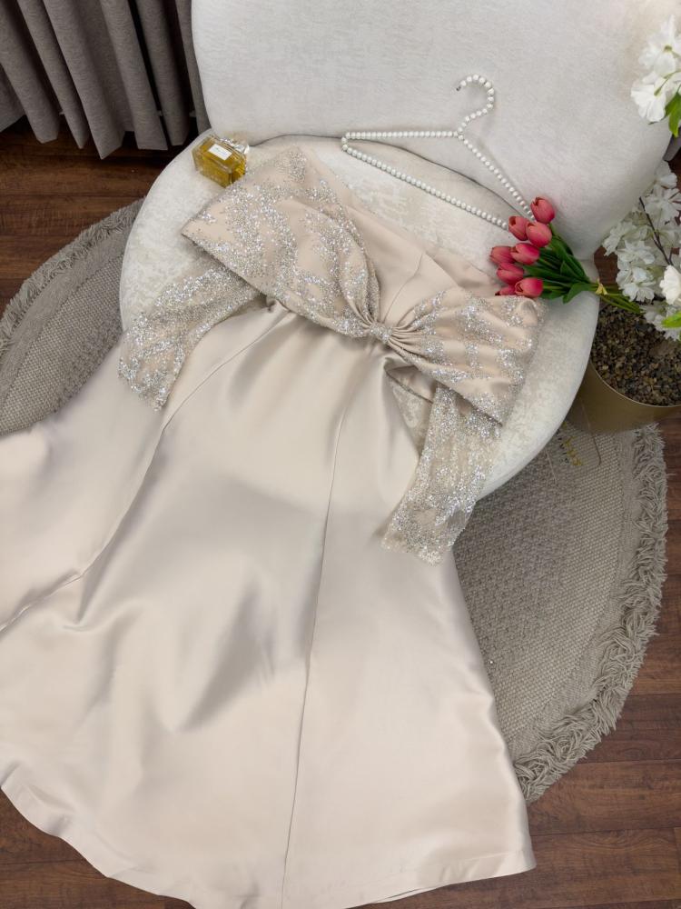 فستان سهرة نسائي راقي باللون البيج الممييز الذي يضفي على جمالك لمسة من الانوثه و الجمال .