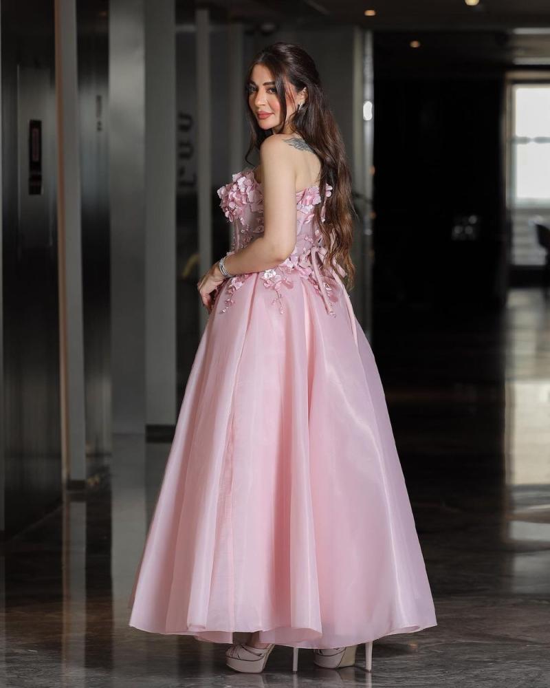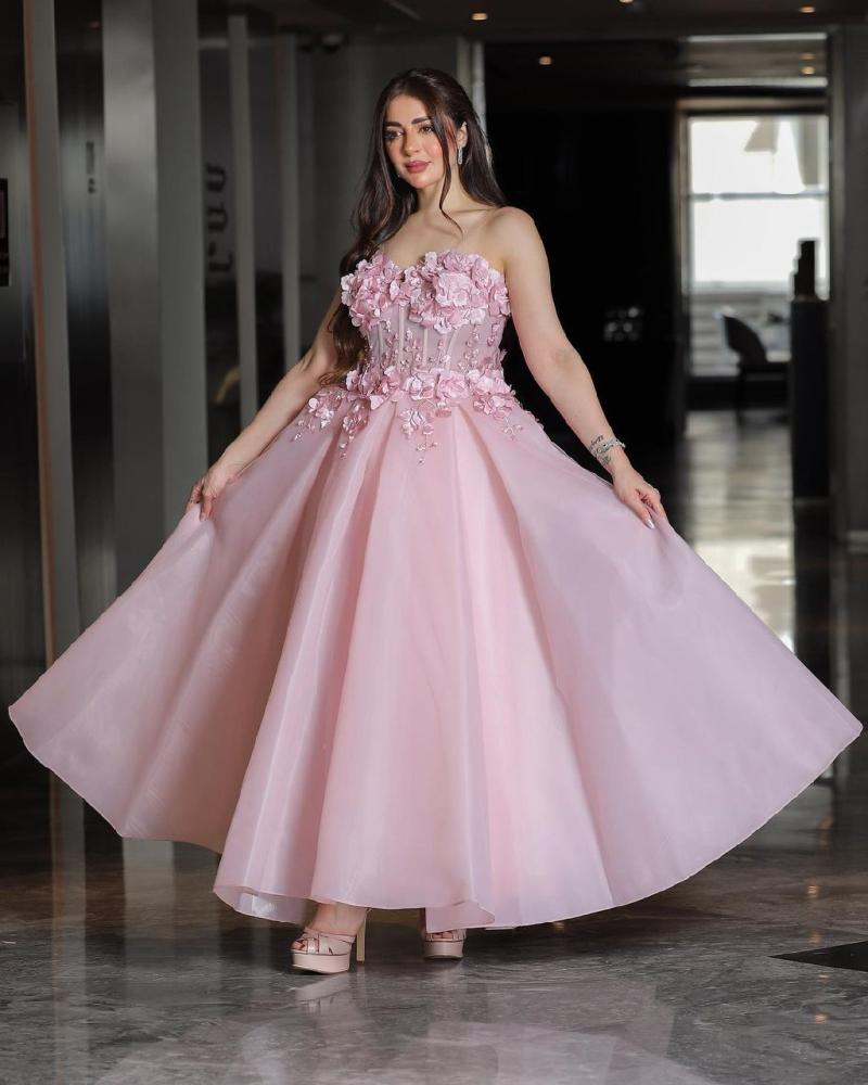 فستان نسائي فاخر باللون البنكي المميز بتصميم راقي ومزين بورد على اصدر لتجعل الفستان يبدو أكثر اثارة و فخامة لجميع المناسبات الخاصة التي ترغبين في أن تبرزي فيها إطلالتك الساحرة في المناسبات الخاصة.