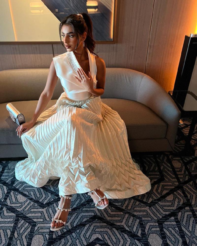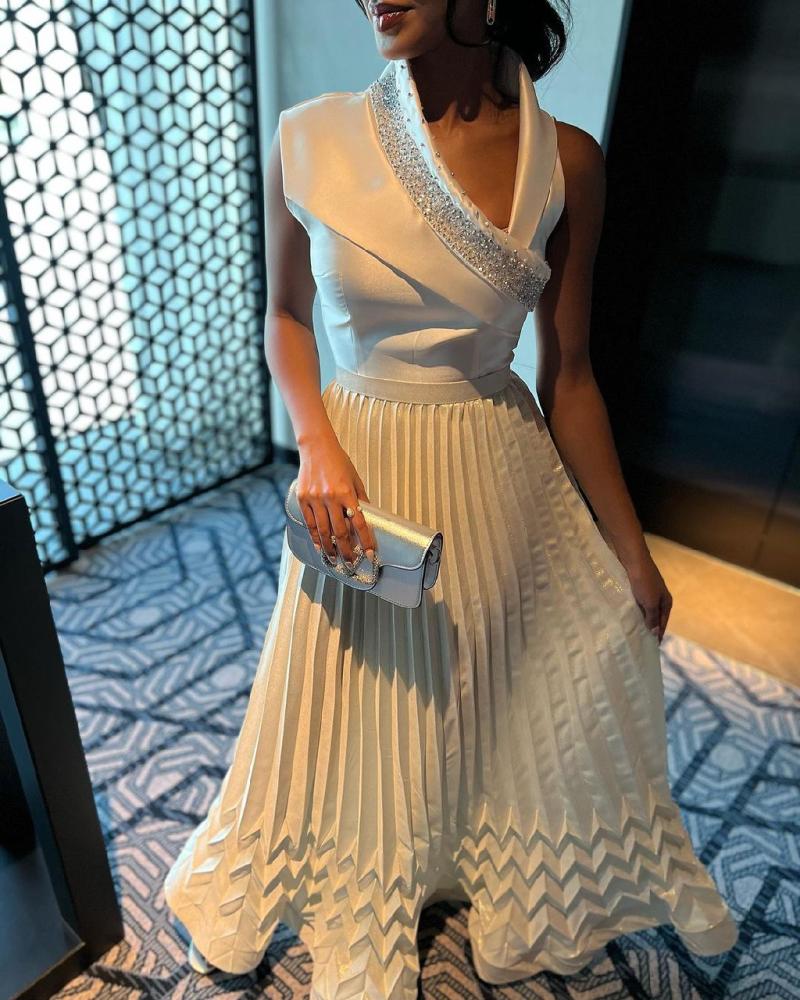 فستان نسائي سهرة راقي باللون الابيض بتطريز جذاب على الاكمام يتميز الفستان بتصميم عصري متميز