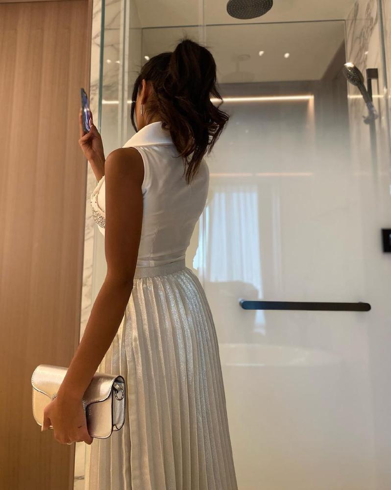 - الأكتاف : تضفي الأكتاف المكشوفة لمسة من الجمالية و الأنوثة على الفستان مما يجعله يبدو أكثر إثارة واناقة .