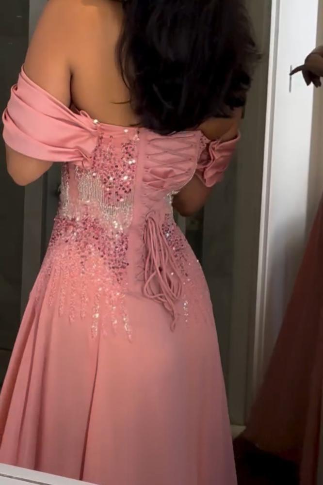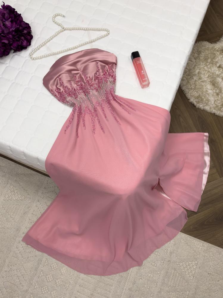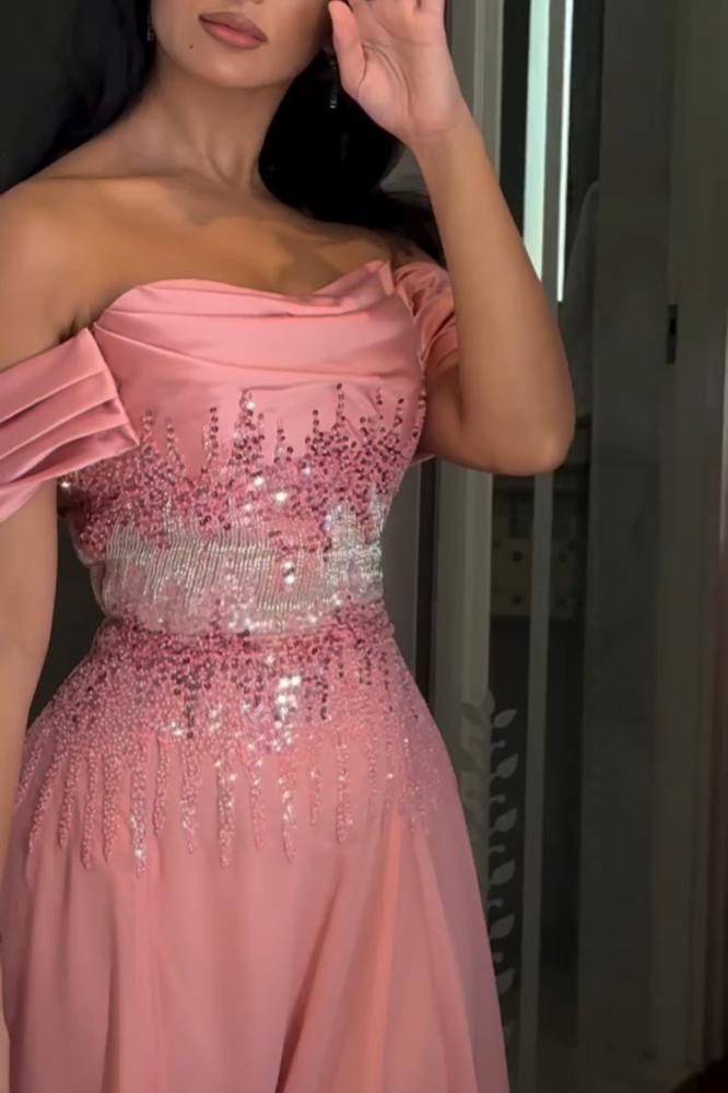فستان سهرة نسائي راقي باللون البنكي الممييز الذي يضفي على جمالك لمسة من الانوثه و الجمال .