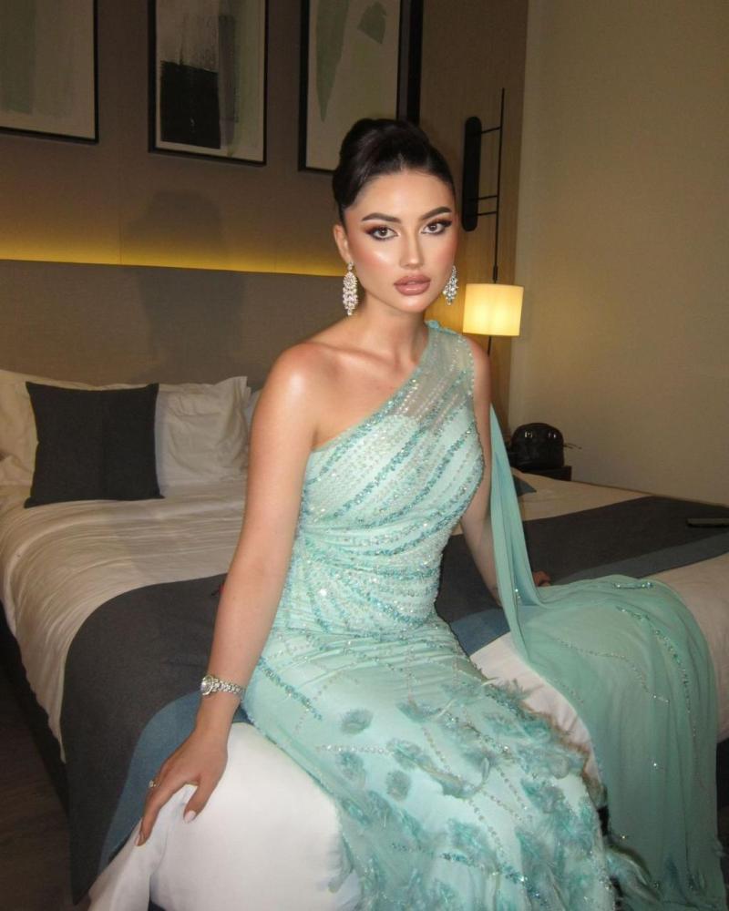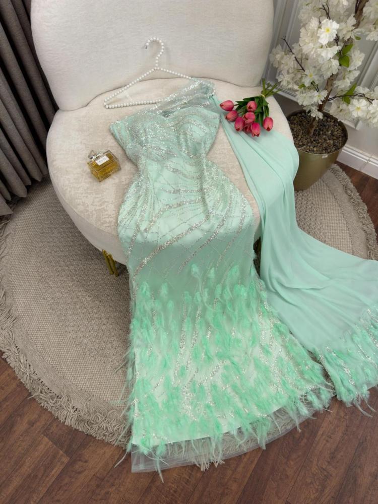 فستان نسائي فخم باللون التيفاني الجذاب ليجعل الفستان يبدو أكثر اثارة و فخامة هذا الفستان مثالي للمناسبات الخاصة والسهرات الفاخرة .