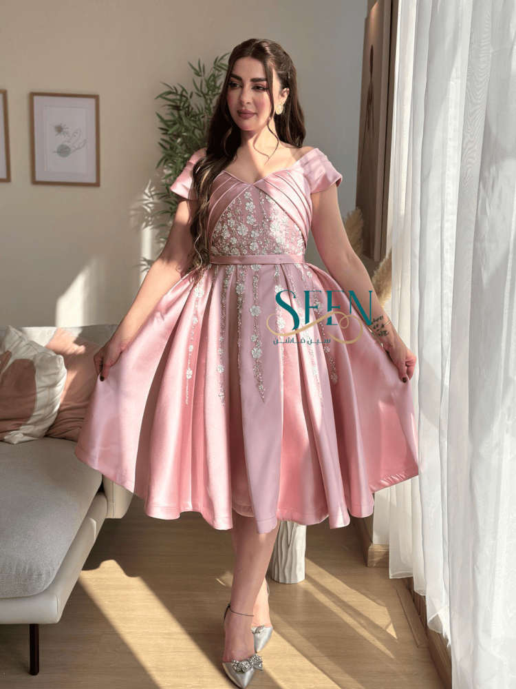 فستان نسائي باللون اللحمي مزين بالورود البيضاء الصغيرة على الصدر والخصر بأشكال جميلة ومتناسقة لتجعل الفستان يبدو أكثر اثارة و فخامة لجميع المناسبات الخاصة التي ترغبين في أن تبرزي فيها أناقتك و انوثتك .