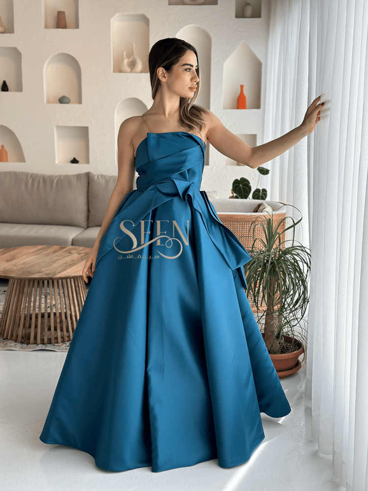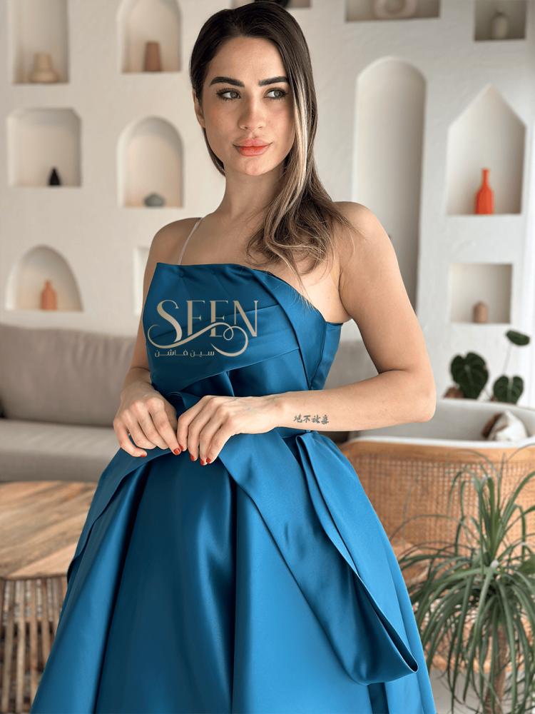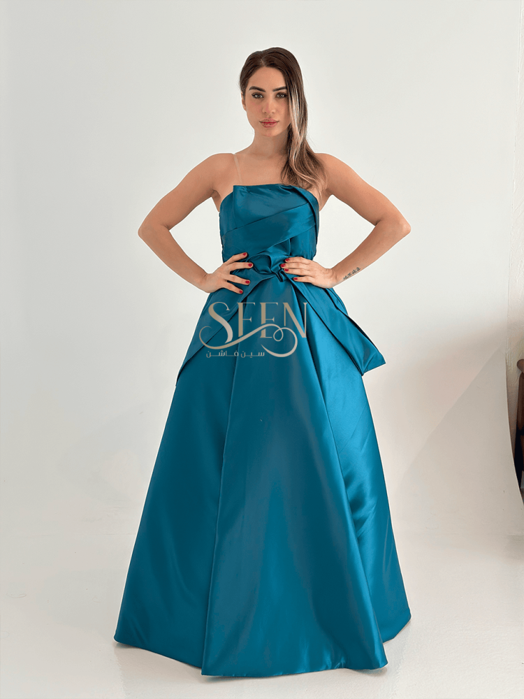 فستان تركوازي سهرة جذاب وبأكتاف مكشوفة لتجعل الفستان يبدو أكثر اثارة وفخامة لجميع المناسبات الخاصة التي ترغبين في أن تبرزي فيها أناقتك وانوثتك.