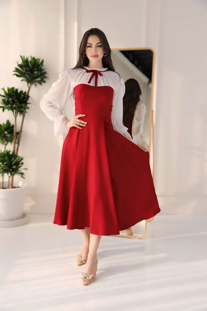• اللون : يتميز الفستان باللون الأحمر والأسود والكحلي والزيتي مما يضفي عليه جاذبية وأناقة فريدة .