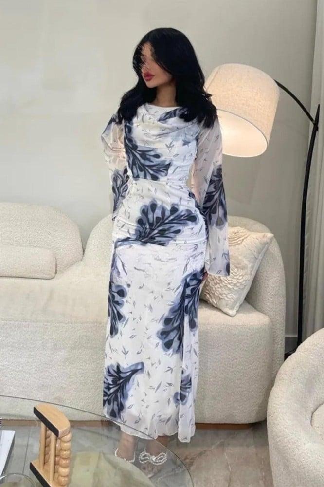 فستان ناعم ابيض مشجر ليجعل الفستان يبدو أكثر اثارة و فخامة هذا الفستان مثالي للمناسبات الخاصة والسهرات الفاخرة.