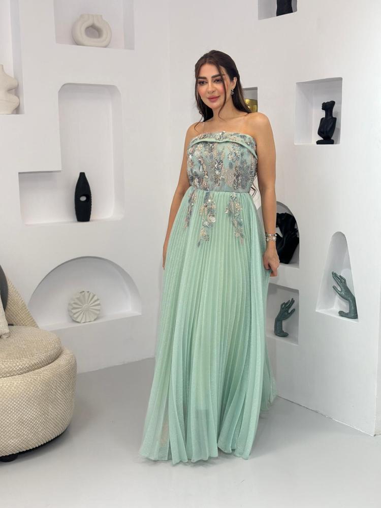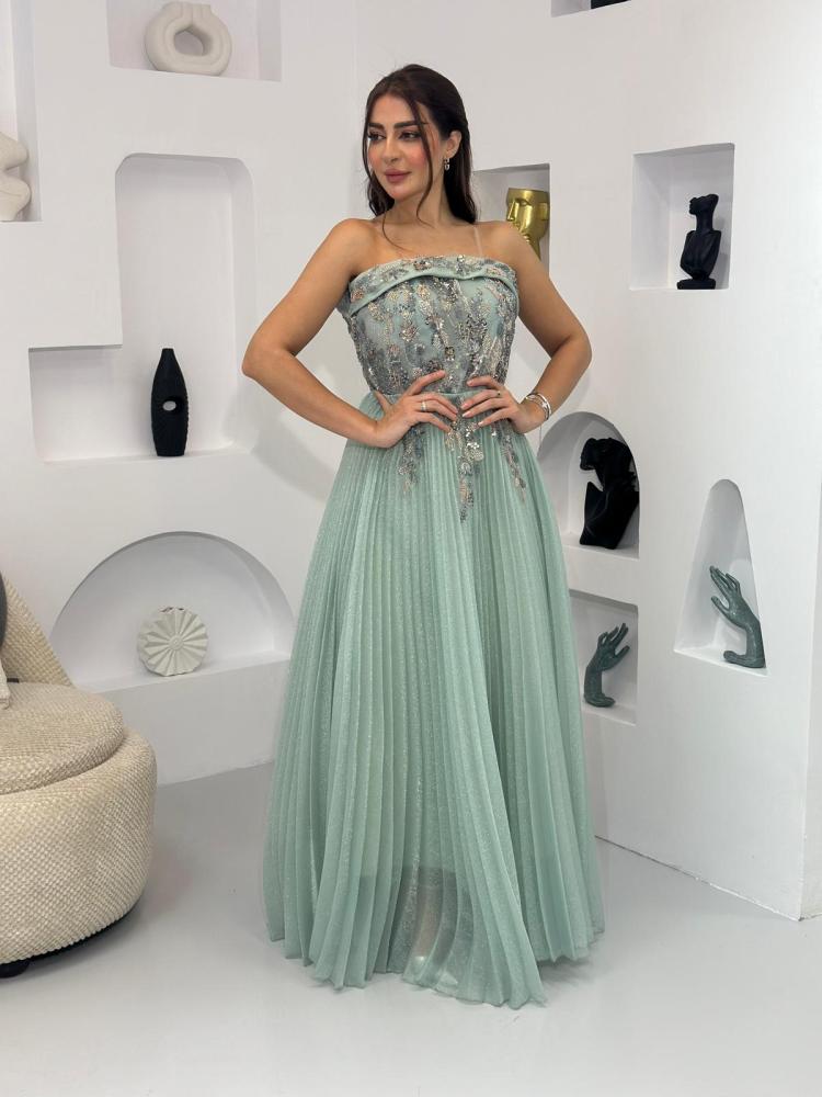 فستان نسائي راقي باللون التيفاني الجذاب ليجعل الفستان يبدو أكثر اثارة و فخامة هذا الفستان مثالي للمناسبات الخاصة والسهرات الفاخرة .