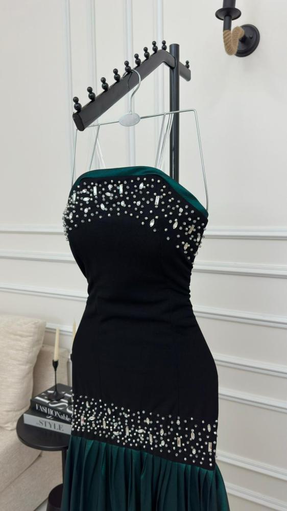 فستان نسائي راقي باللون الزيتي و الاسود الجذاب ليجعل الفستان يبدو أكثر اثارة و فخامة هذا الفستان مثالي للمناسبات الخاصة والسهرات الفاخرة .