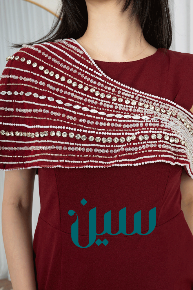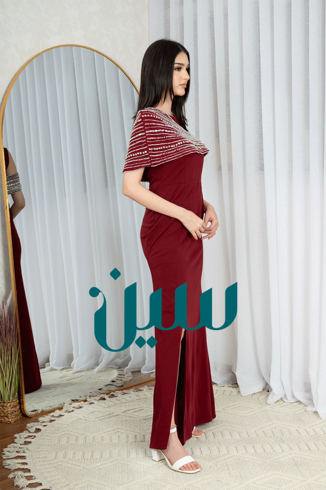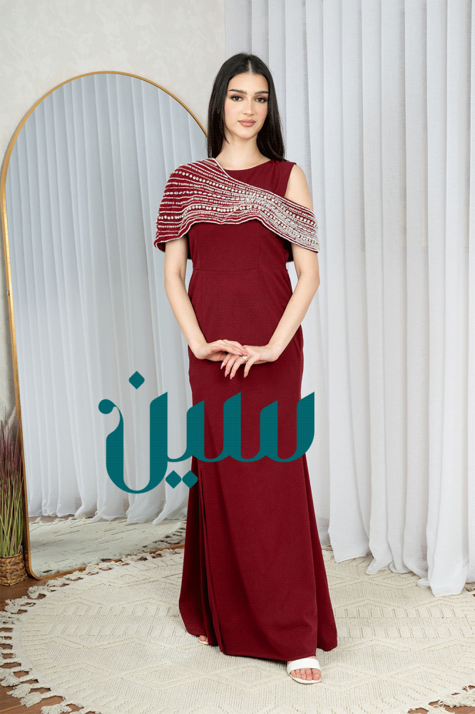 فستان نسائي راقي باللون العنابي الجذاب ليجعل الفستان يبدو أكثر اثارة و فخامة هذا الفستان مثالي للمناسبات الخاصة والسهرات الفاخرة .