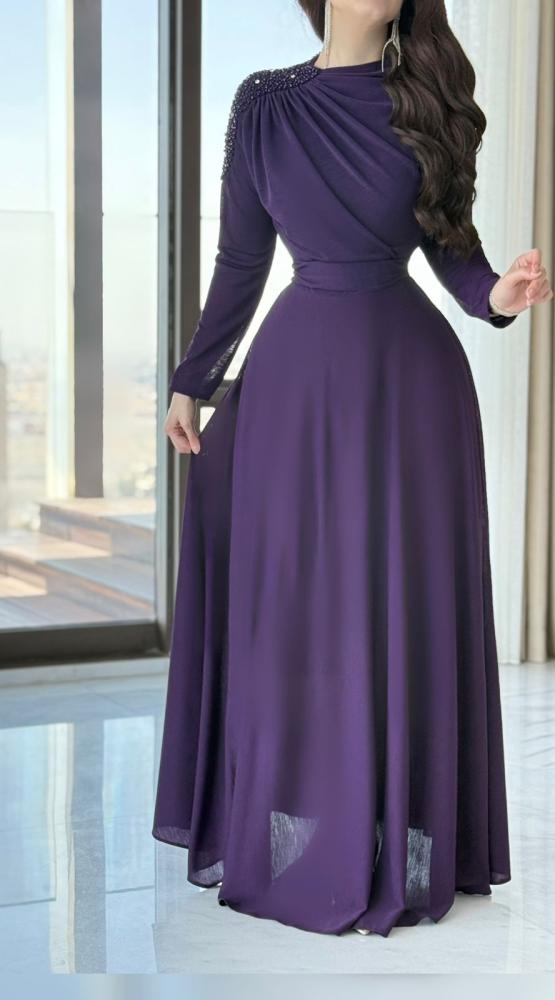 فستان سهرة طويل بلون بنفسجي ملكي (موف غامق)، يتميز بتفصيل أنثوي على الكتف مزين بالخرز البراق، مما يضفي لمسة فاخرة وراقية. التصميم العلوي ملفوف بشكل أنيق يعزز منطقة الخصر، بينما يتسع الجزء السفلي بانسيابية فخمة تمنح الفستان مظهرًا ملكيًا. القماش خفيف وناعم، ينساب برقي مع الحركة، كما أن الأكمام الطويلة تضيف لمسة من الاحتشام والأناقة الكلاسيكية